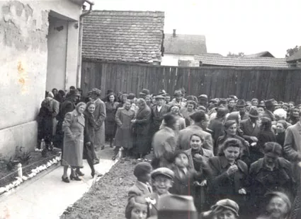 This photo was taken in Ginta in 1941. My father, Eugen Kohn, is standing in the center, wearing a cap. We had been evacuated to the yard of the gendarmerie because of an unexpected census. I remember the gendarme shouting out the registry of Jews, and we had to present ourselves one family at a time. We worried about whether they would ever let us go home.