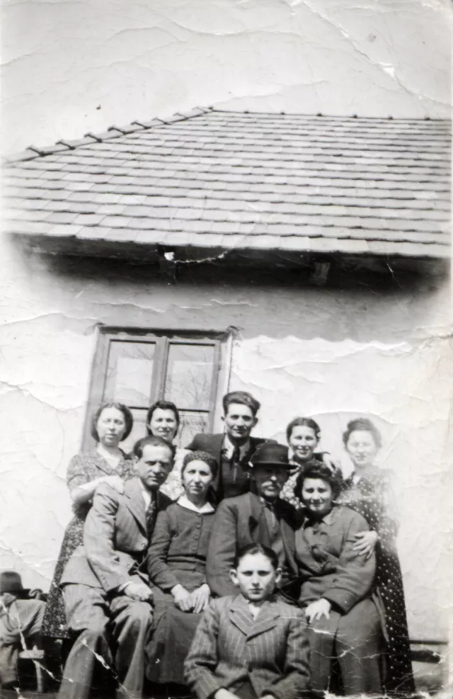 This family picture was taken behind our parents' house in Aghiresu, beneath the kitchen window, at the beginning of the 1940s. In the back row, from left to right: my sisters, Bella Fulop and Margit Szinetar, Jozsef Szinetar, Margit's husband, my sister, Iren, and myself, Elza Fulop; in the middle row: my brother, Erno Fulor, my parents, Maria Karolina Fulop and Moricz Fulop, and my brother's wife, Regina; in the front row: Tibor Szinetar, the son of Margit and Jozsef Szinetar.