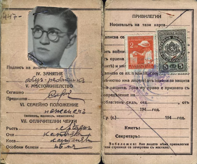This was my identity card issued by the Bulgarian authorities in accordance with the Law for the Protection of the Nation in 1943. What was special about that card, was that my name here is changed. Instead of Leon Avram Kalaora, the Biblical and even more 'Jewish' name is written: Jeuda Avraam Avraam. In fact, the fascists made me more Jewish than I was. My father's name was Avram Avram Kalaora, but here 'Avram' is written with double 'a'. My family name is missing and my first name translated means 'a Jew.' In fact, at that time all identity cards of the Bulgarian citizens were green. Only the Jewish ones were pink.
