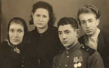 From left to right: my grandmother Mina Beitler, her children Rochel, Ruvim and Chaim, who had just come back from the army. The picture was made in Vilnius in 1946.