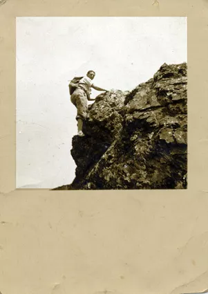 During World War II, Ismet Inönü who was prime minister had used all this political power to refrain from going to war and due to this efforts Turkey did not enter the war. Only during that time, incentives were provided to the public for learning German. The German teachers that were brought from Germany taught German to the youth at the public education centers for free. I took advantage of this opportunity and went to courses five days a week between 7 p.m. and 9 p.m, two hours a day, for two years. The German teacher there was both young and into sports, he fell in love with a 26 year old Armenian student, he, himself was 35 years old. He used to invite us to his home for tea on the weekends, this way, we got to practice and the two of them saw each other. We went to Polonezköy one spring day with this group [A village and picnic place founded by Poles on the Asian side]. My friend who took my picture used a trick, this hill that gives the impression that I am climbing it is only 1.5 m.s high, when he took the picture from below it looks like a mountain.