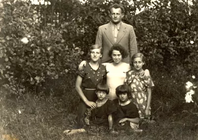 I, Riva Smerkoviciene, am in a white dress in the center. This picture was taken in Shimkayche in 1934, where I was in exile for underground Communist activity. I am surrounded by the Jewish family, with whom I was staying. Feige is to the right, the owner of the house is next to her. They and their daughters perished in occupation during the Great Patriotic War. I cannot recall their names.