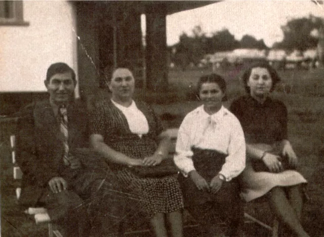 I, Sally Barzak, and my family visiting me in Yassy, where I was taught. We were photographed at the entrance to the French boarding school where I studied. From left to right: my cousin Shoimu, the son of my mother's older brother Mark; my mother Tonia Barzak, nee Roitberg; I, Sally Barzak; and my aunt Etia, my mother's younger sister. Photo made in Yassy in 1939, one year before the Soviet power was established in Bessarabia.